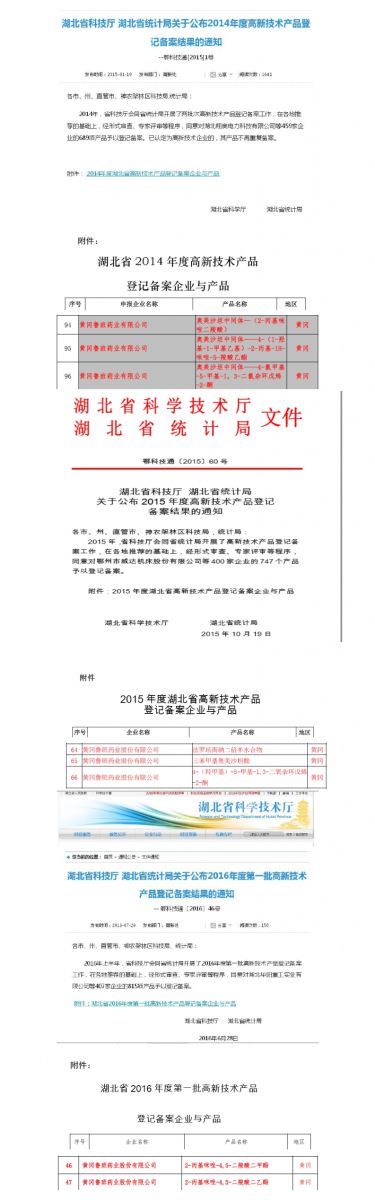 2016年6月,公司2-丙基咪唑-4,5-二羧酸二甲酯、2-丙基咪唑-4,5-二羧酸二乙酯2個產(chǎn)品被湖北省科學(xué)技術(shù)廳授予高新技術(shù)產(chǎn)品予以登記備案,截止今日,公司高新技術(shù)產(chǎn)品已達8項。
